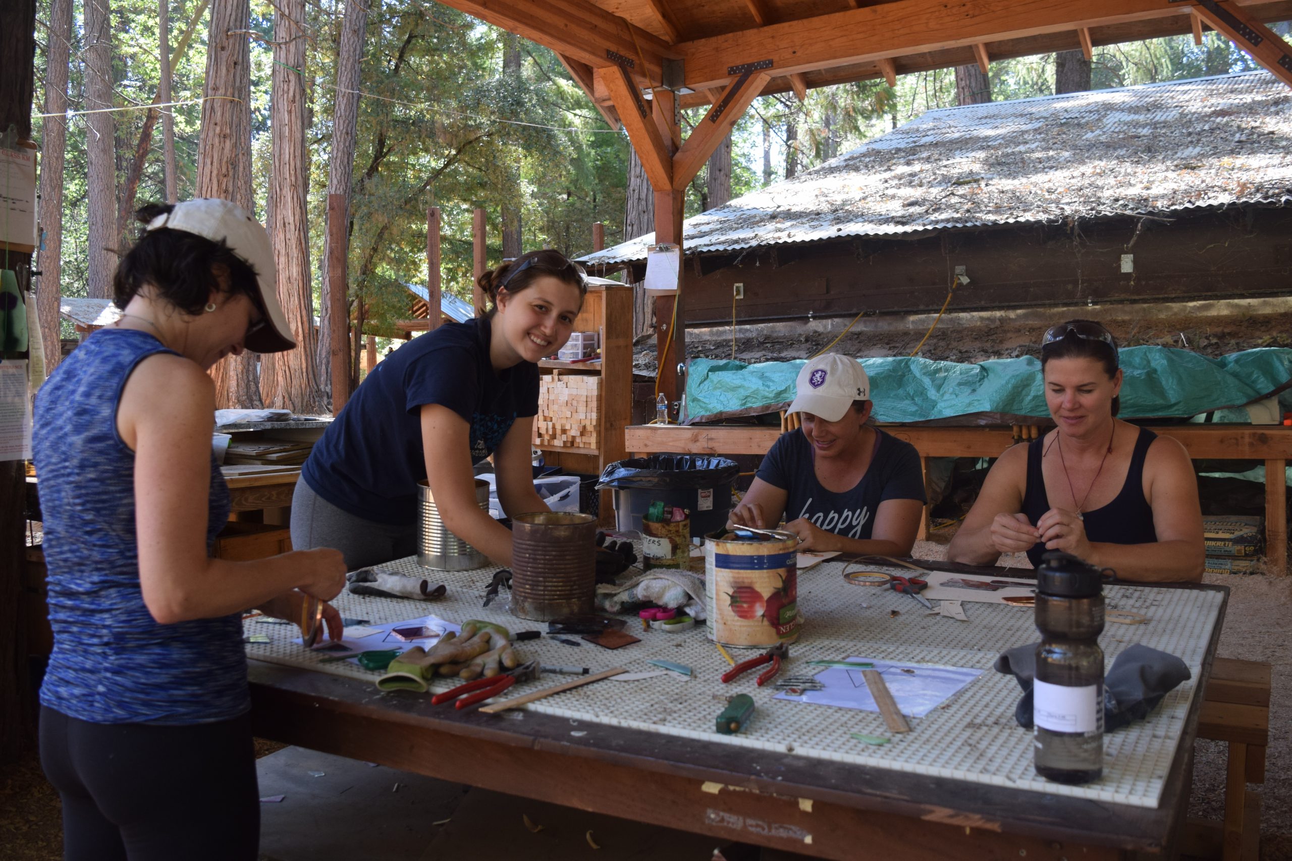 Four women work on arts and crafts at a wooden table in a covered outdoor area surrounded by trees and cabins. They appear to be focused and smiling, enjoying the activity together in a rustic setting.