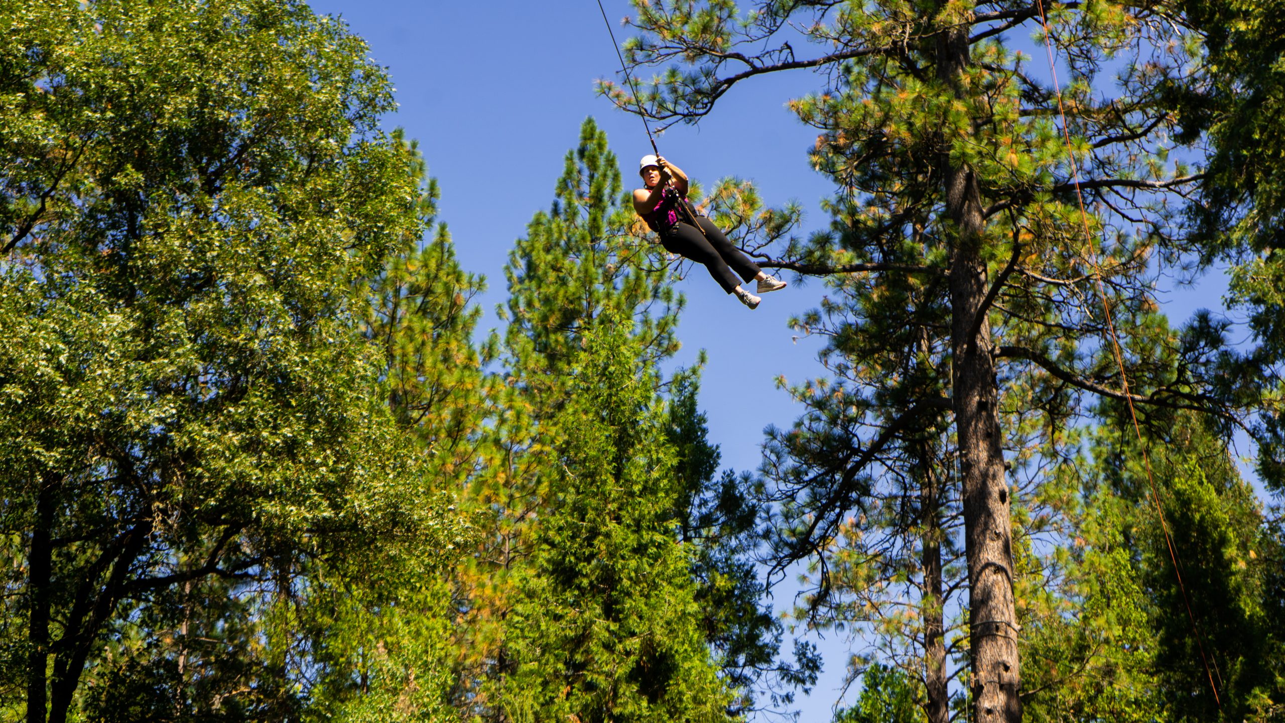 A person ziplining through tall pine trees on a sunny day, suspended high above the forest floor against a clear blue sky.
