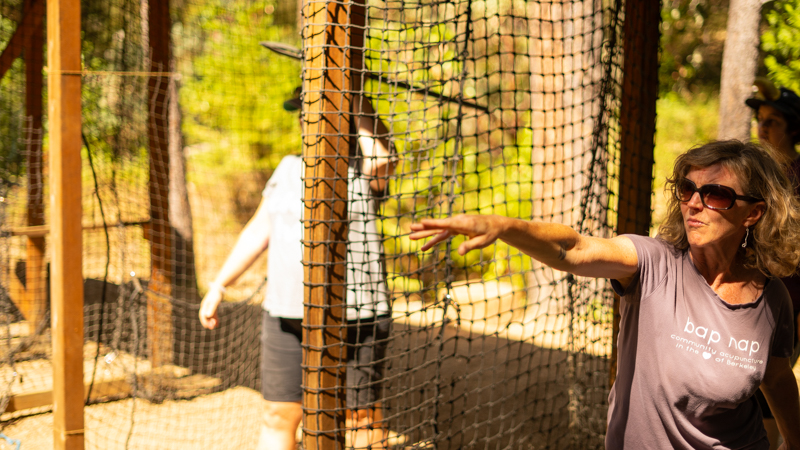 A woman wearing sunglasses and a gray shirt throws an axe at a wooden target in an outdoor axe-throwing area, with a net and other people in the background. Sunlight filters through trees.