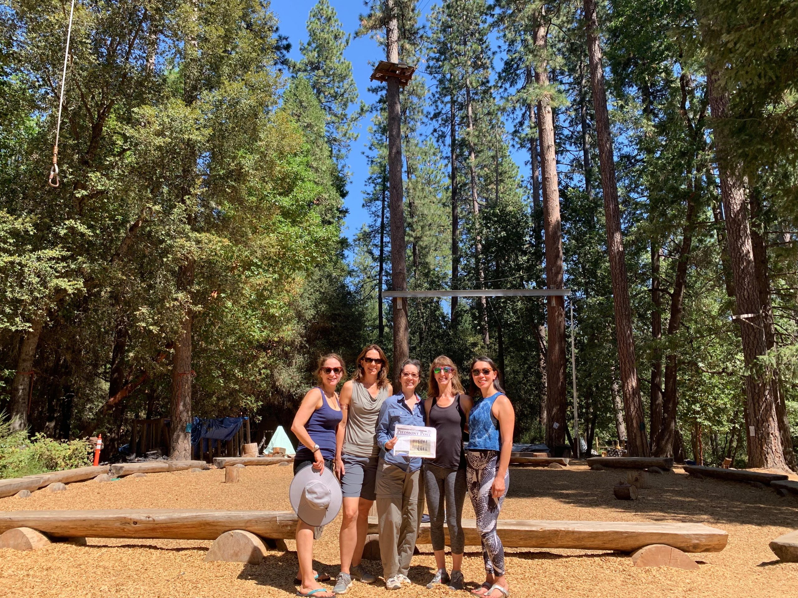 Five women stand together outdoors in a wooded area with tall trees, sunlight filtering through. They are smiling at the camera, and one is holding a white sign. Wood chips cover the ground. A ropes course is visible in the background.