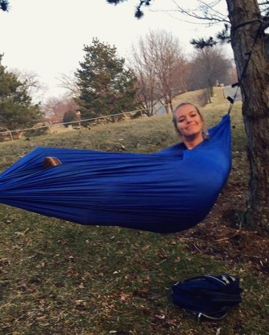 A woman smiles while relaxing in a blue hammock tied between trees in a grassy park. A backpack rests on the ground nearby, and trees and a road are visible in the background.