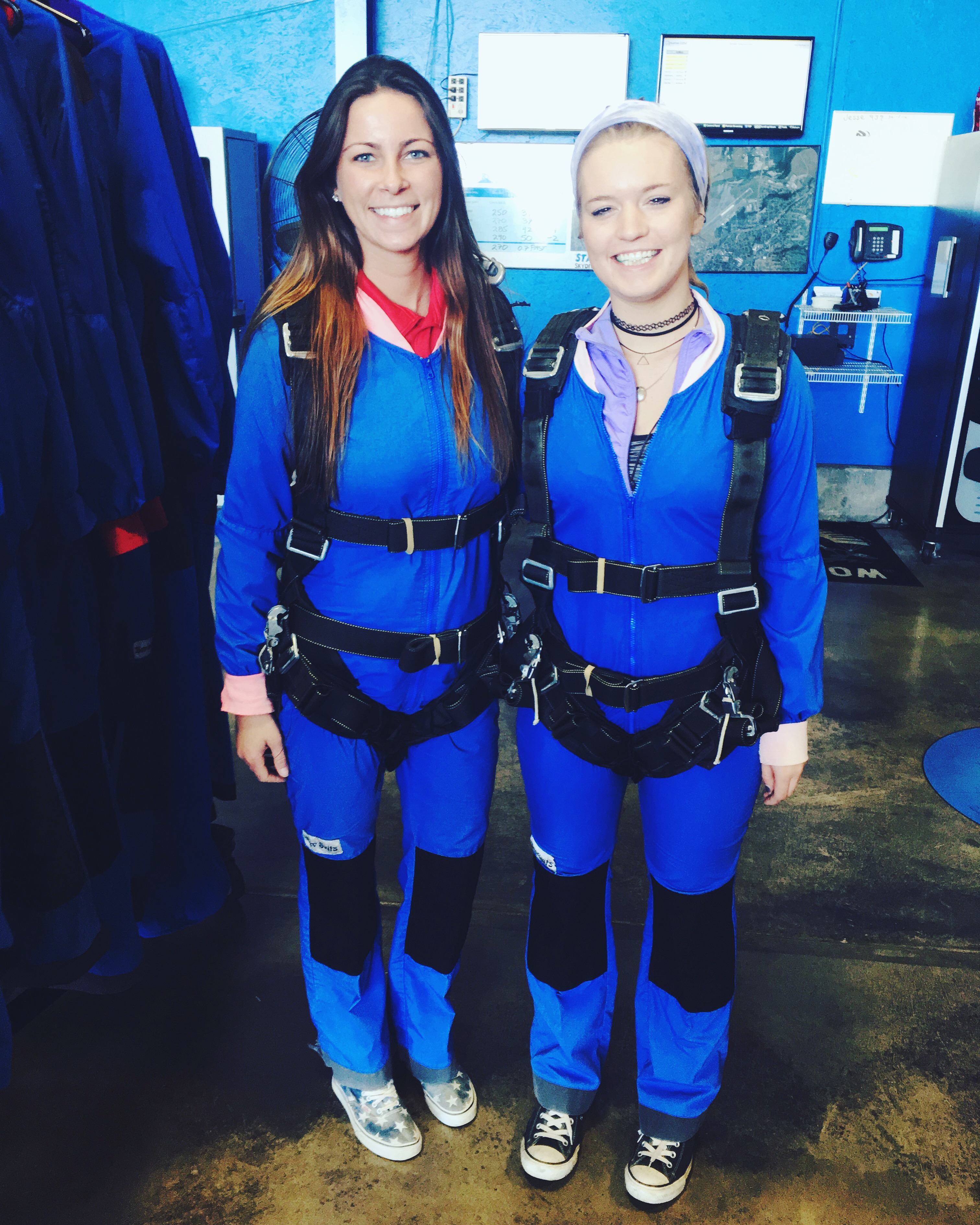 Two women wearing blue jumpsuits and skydiving harnesses stand side by side, smiling indoors on a concrete floor with skydiving equipment and monitors in the background.