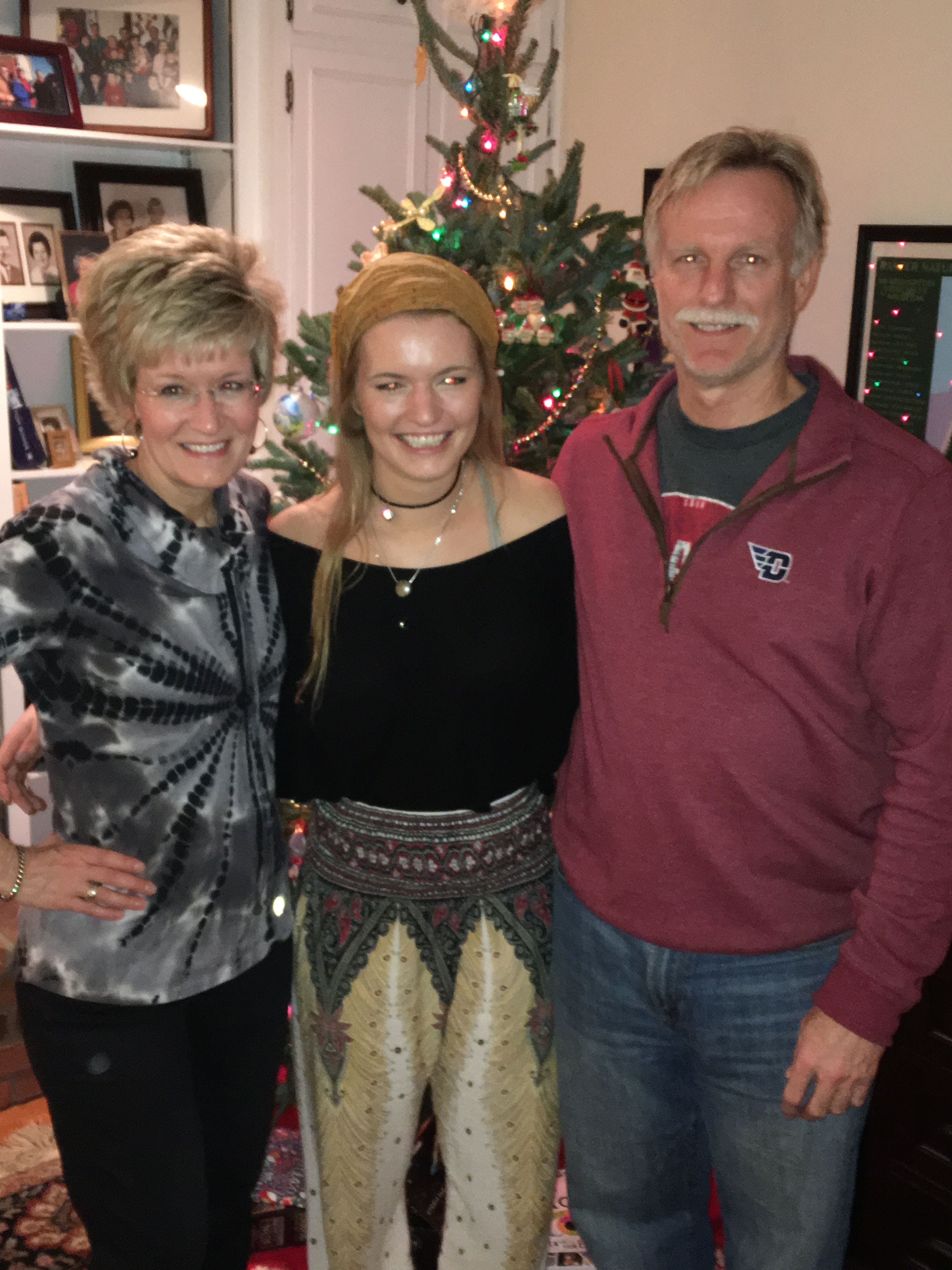 Three people stand smiling in front of a decorated Christmas tree. The woman on the left wears a black and white top, the young woman in the center wears patterned pants and a headband, and the man on the right wears a red pullover.