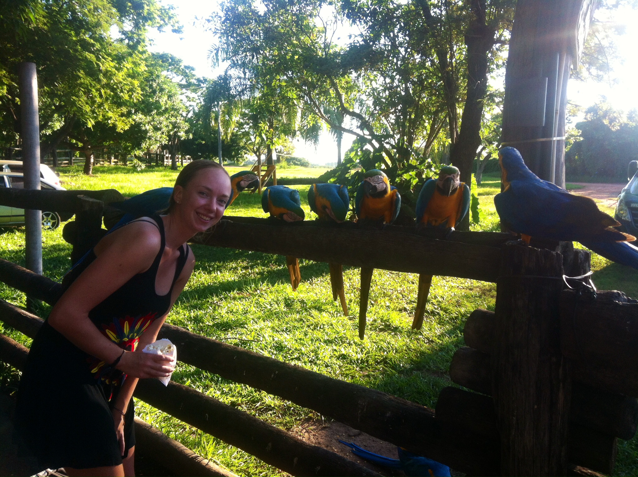 A woman smiles next to a wooden fence lined with colorful parrots outdoors, surrounded by lush green trees and sunlight filtering through the leaves.