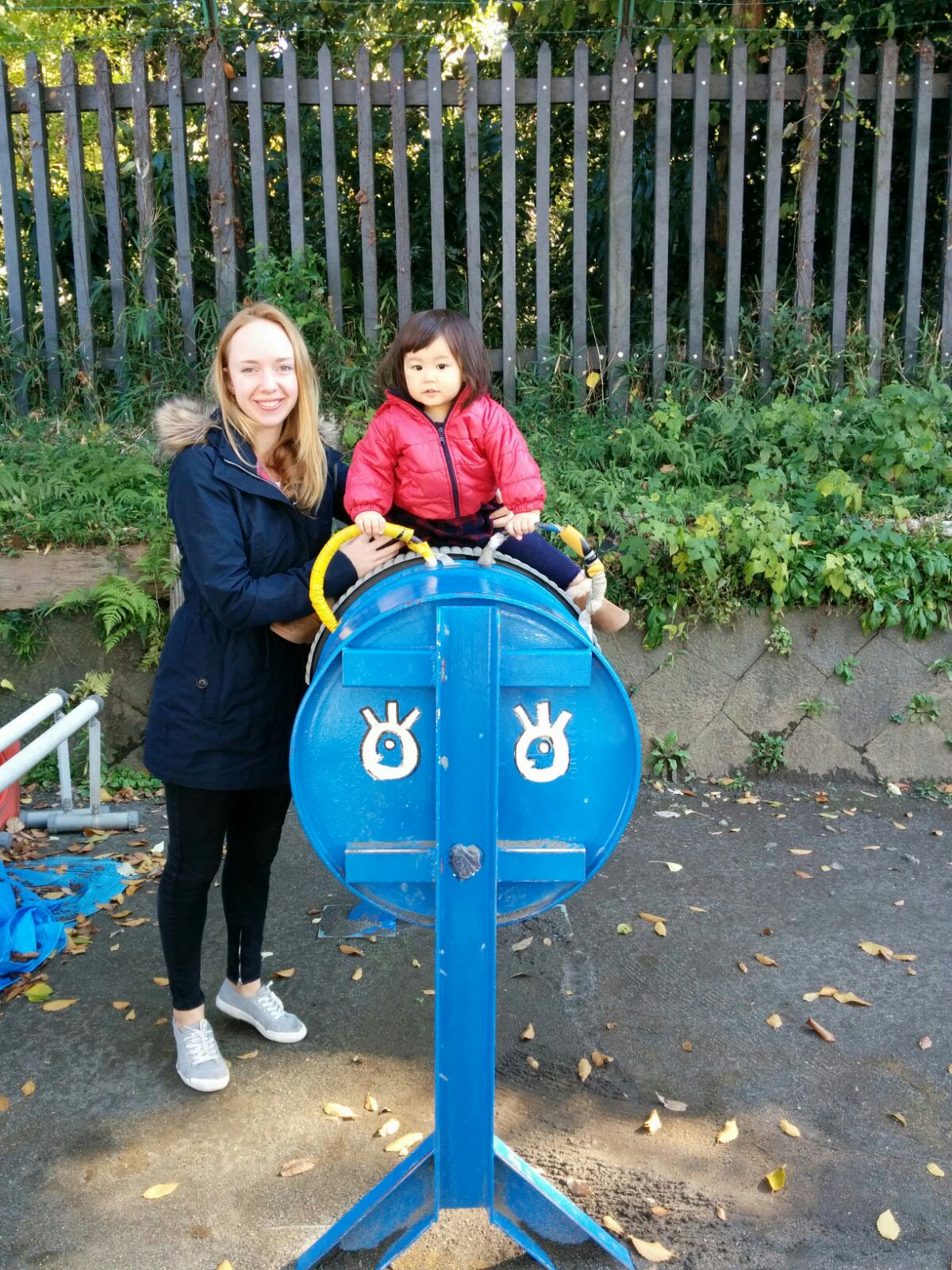 A woman stands next to a young child sitting on a blue playground ride shaped like an animal. They are outdoors, with greenery and a wooden fence in the background. The woman is smiling at the camera.