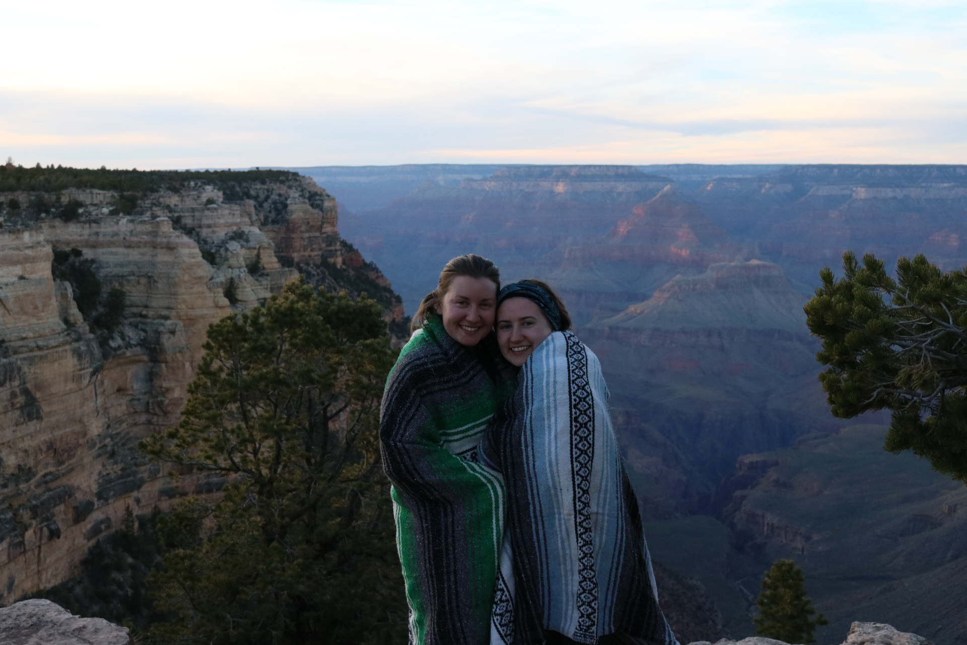 Two smiling people wrapped in blankets stand close together on the edge of the Grand Canyon at sunset, with dramatic cliffs and a valley in the background.