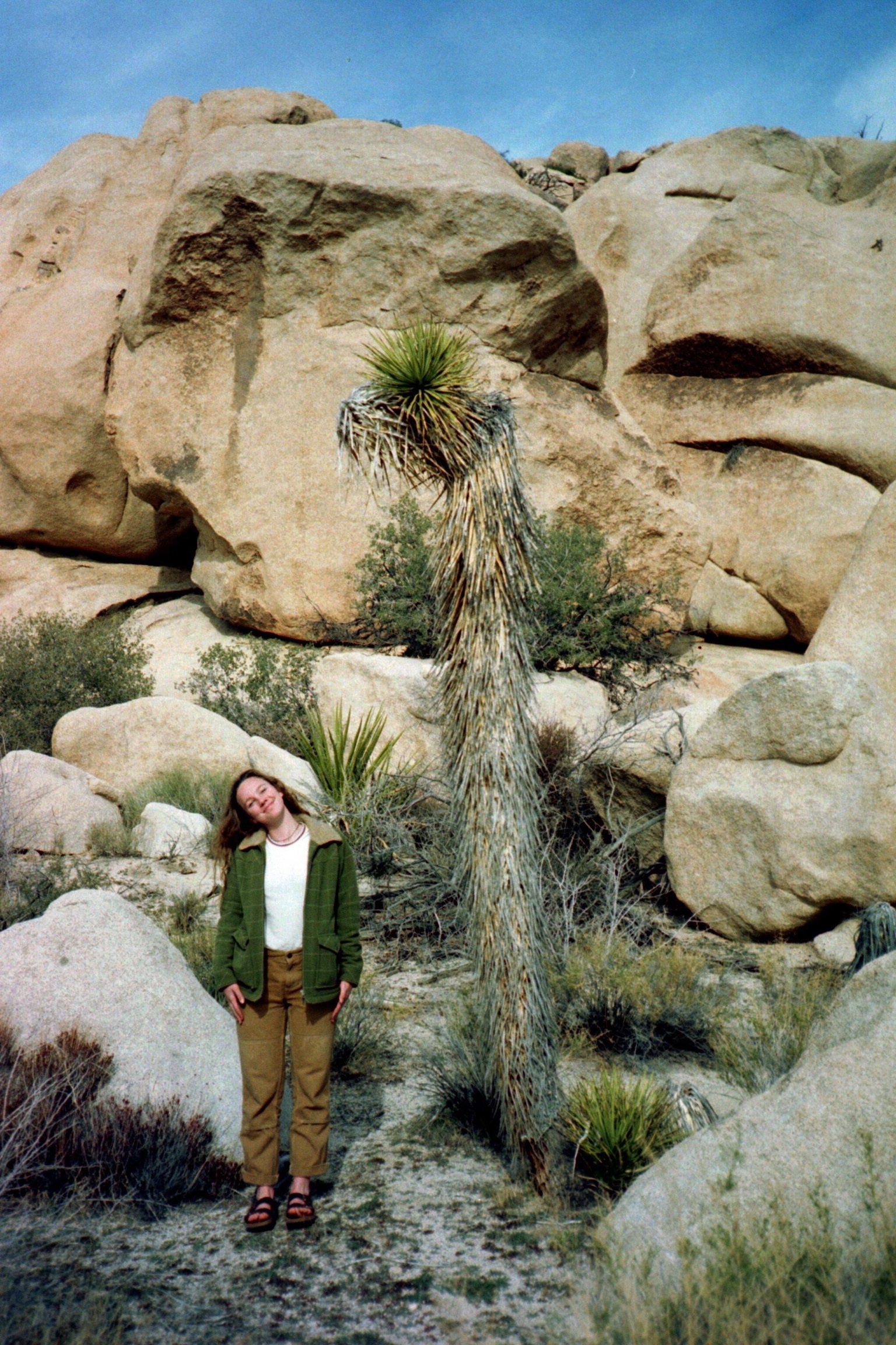 A woman in a green jacket and tan pants stands tilting her head beside a drooping, shaggy-looking plant in a rocky desert landscape with large boulders and sparse vegetation.