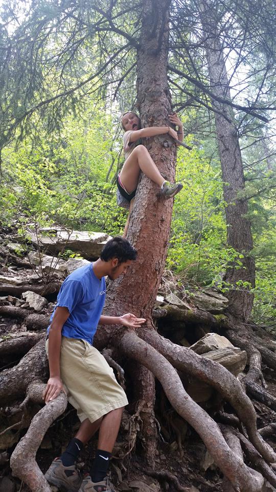 A young woman climbs a tree while a young man stands nearby on exposed roots, reaching out toward her. The scene is set in a forest with dense greenery and sunlight filtering through the trees.
