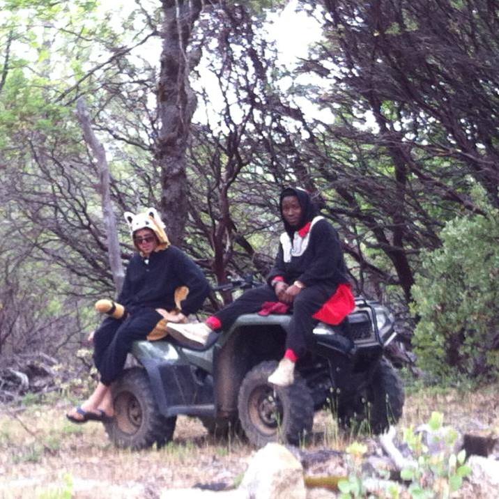 Two people in animal-themed onesies sit on an ATV in a wooded area. One wears a bear hoodie and sunglasses, while the other wears a black and red outfit. Trees and bushes surround them, creating a forest setting.