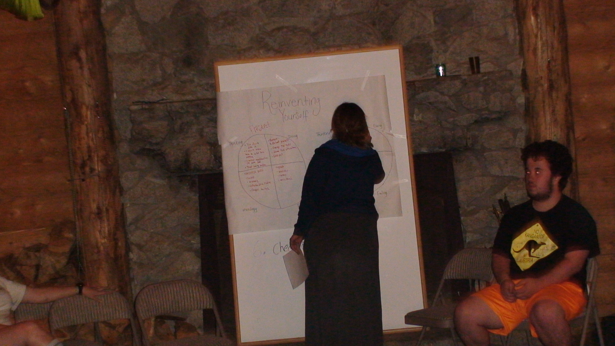 A person stands in front of a whiteboard with handwritten notes, presenting to others seated nearby in a rustic room with log walls and a stone fireplace. One person is seated wearing an orange pair of shorts and a black shirt.