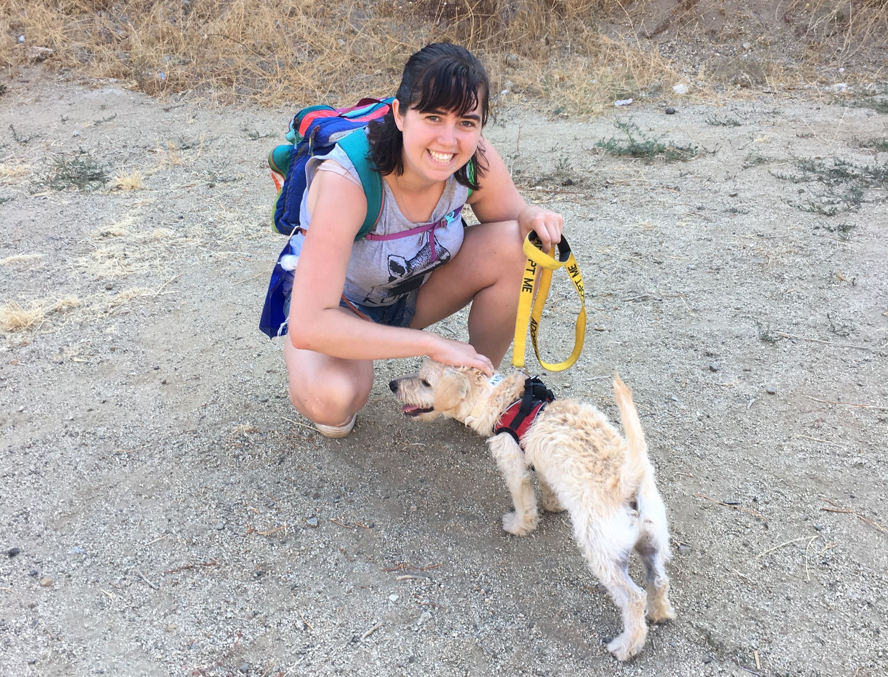 A woman with a backpack smiles while kneeling to pet a small, light-colored dog wearing a harness and leash on a dry, dirt path with dried grass in the background.