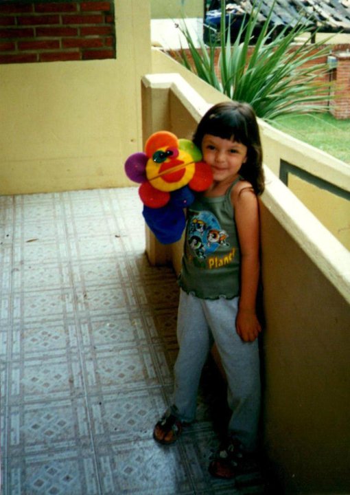 A young girl with dark hair stands on a tiled balcony, smiling and holding a colorful plush flower toy. There are green plants and brick walls visible in the background.