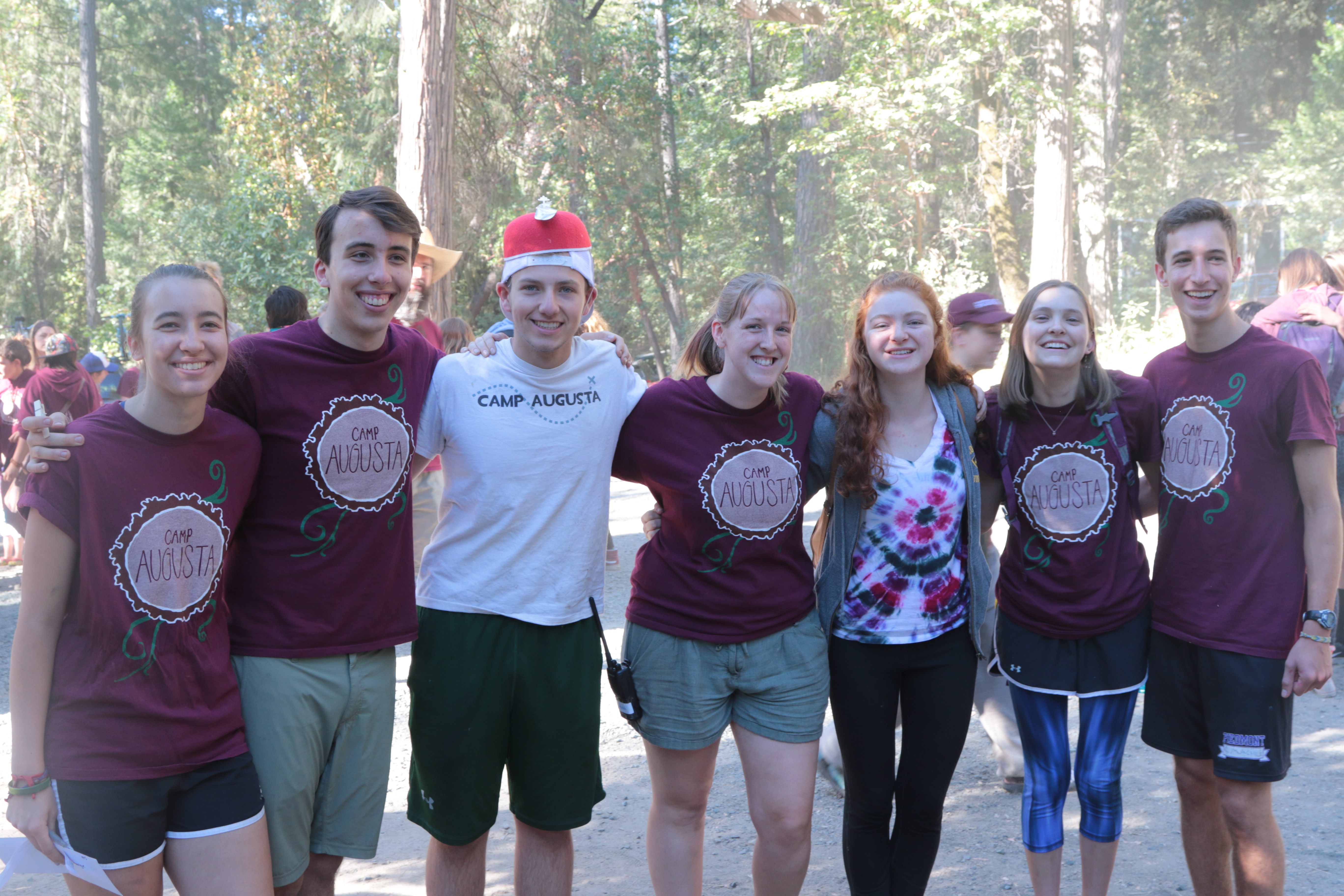 A group of seven smiling young people stand outdoors in a sunny, wooded area. Five wear matching maroon Camp Augusta shirts, one wears a tie-dye shirt, and another wears a red and white hat and a Camp Augusta tee.