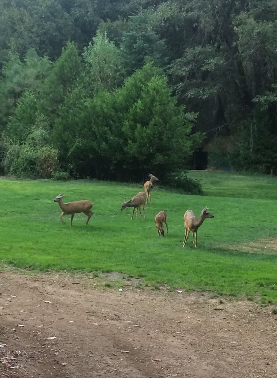 Five deer stand and graze on a grassy clearing bordered by dense green trees and bushes, with a wooded area in the background.
