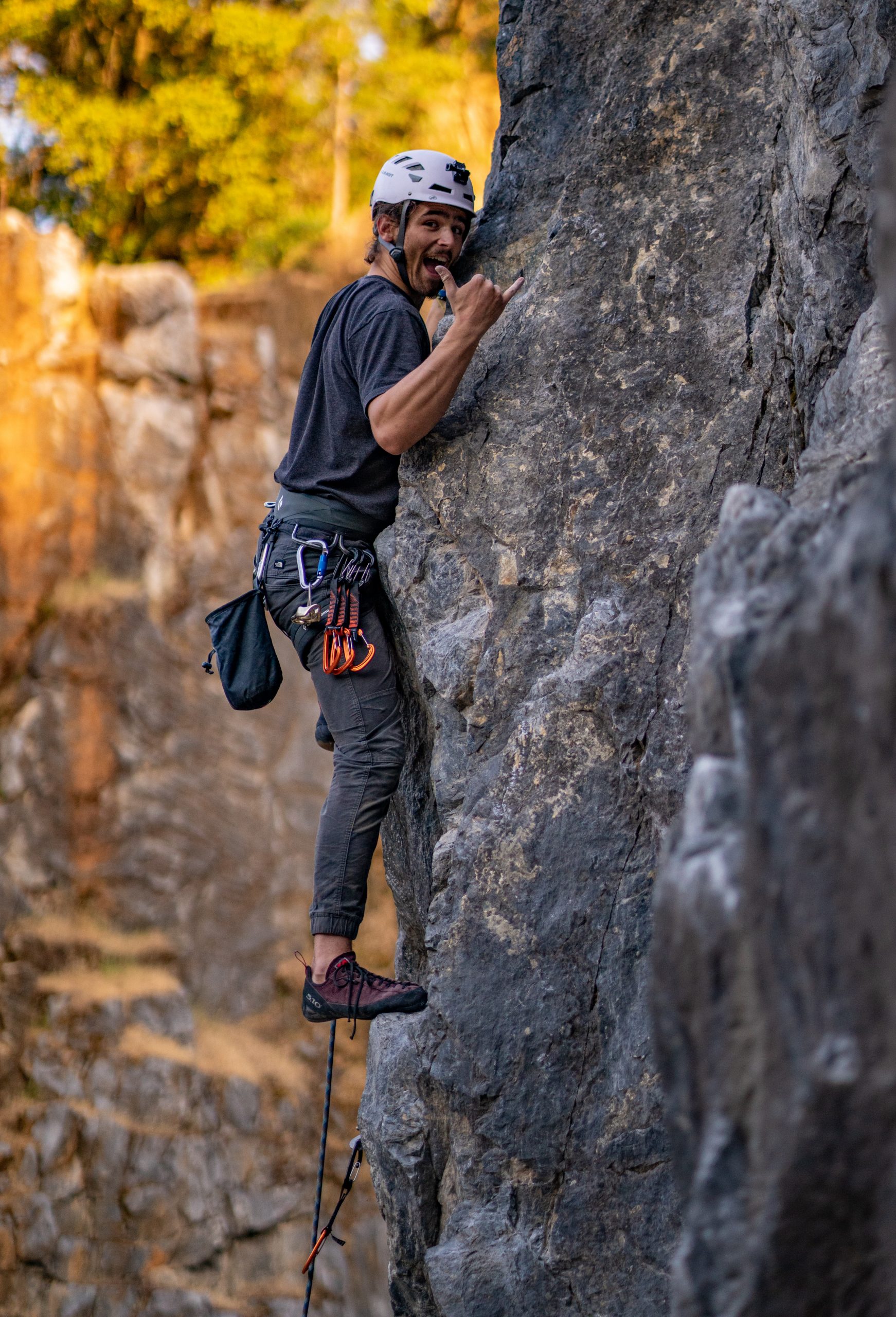 A person wearing climbing gear and a helmet smiles and gestures with their hand while scaling a vertical rock face outdoors, with sunlight illuminating the background.