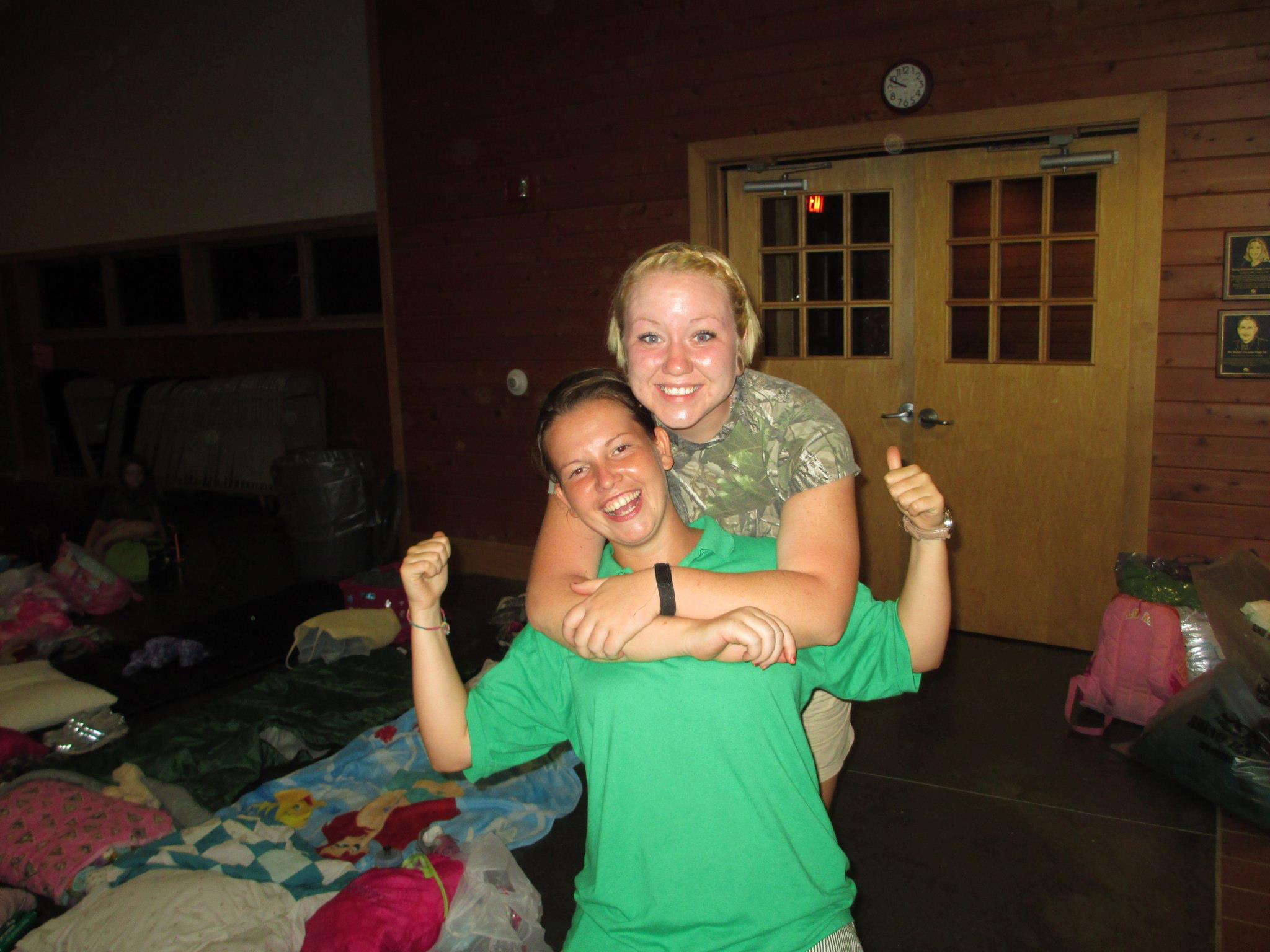 Two people smiling; one wearing green gives a thumbs-up while the other, in camouflage, hugs them from behind. They are indoors with sleeping bags, wooden walls, and bags scattered around.