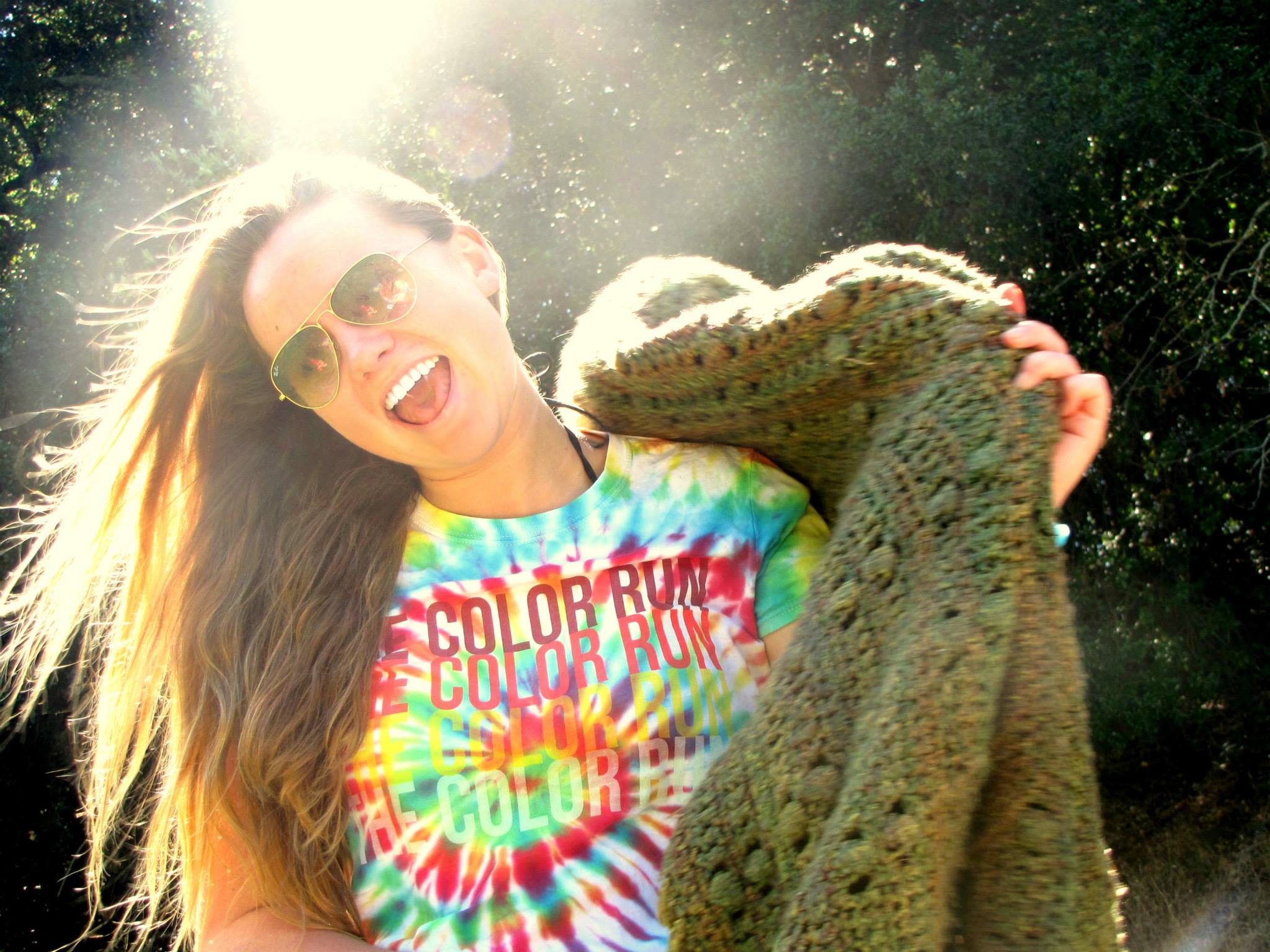 A smiling person in sunglasses and a tie-dye “Color Run” shirt holds a large, textured alligator or crocodile prop outdoors with sunlight streaming in from behind.