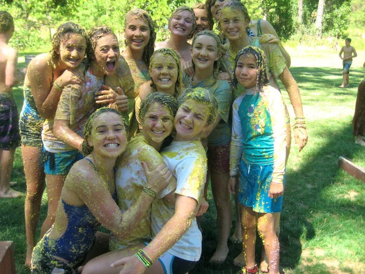 A group of smiling kids and teens, covered in yellow paint, huddle together outdoors on green grass on a sunny day, enjoying what seems to be a fun, messy activity. Trees and more people are visible in the background.