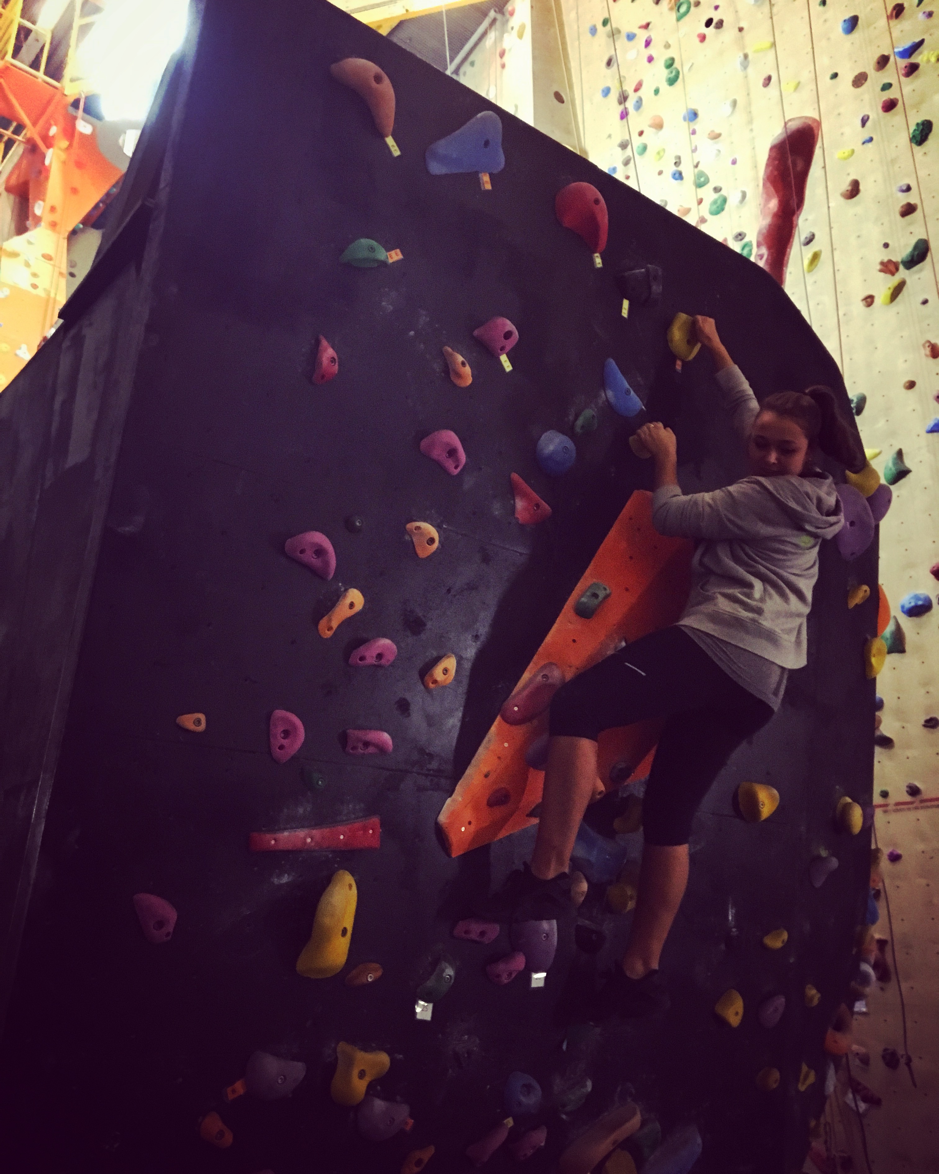 A woman wearing a gray hoodie and black leggings climbs a dark indoor rock climbing wall with colorful holds at a climbing gym.