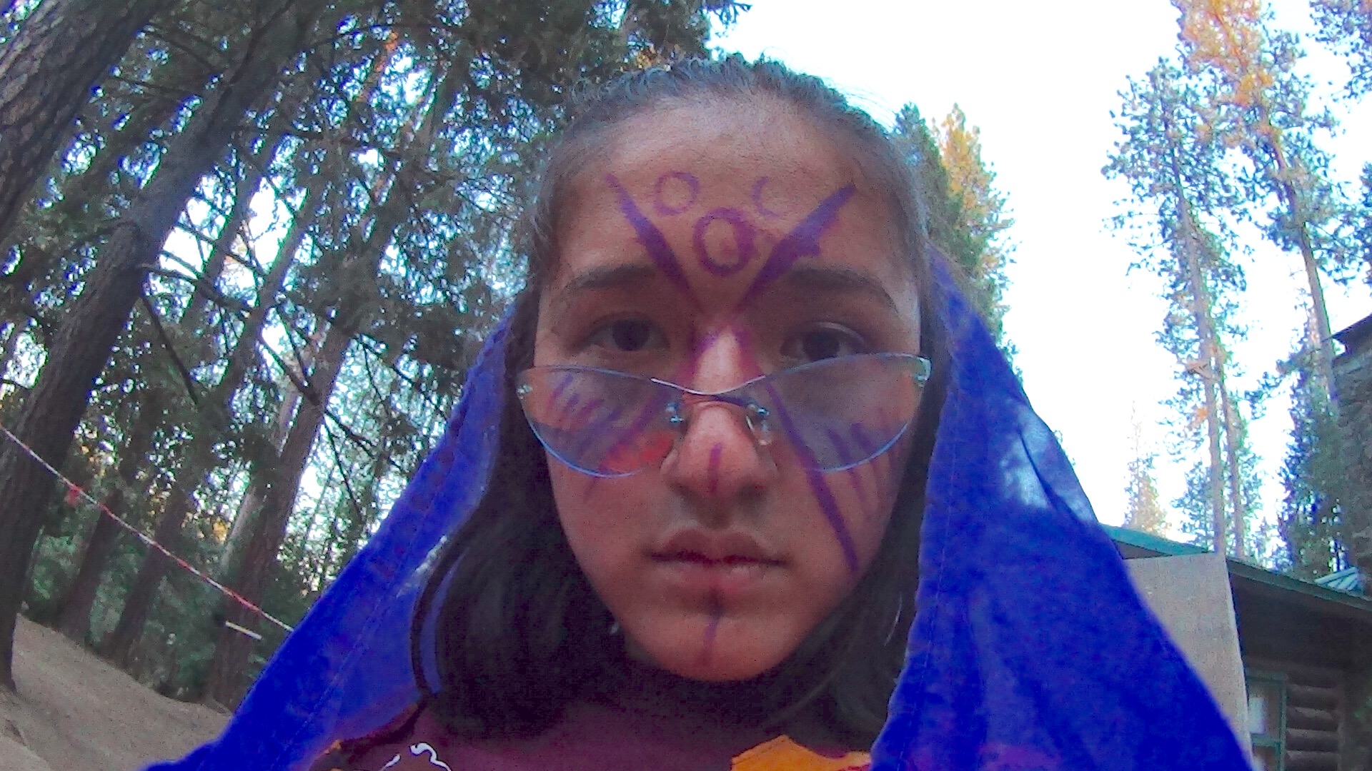 A person with a blue veil, face painted with purple geometric patterns, and wearing glasses, looks directly at the camera. Tall trees and a building are visible in the outdoor background.