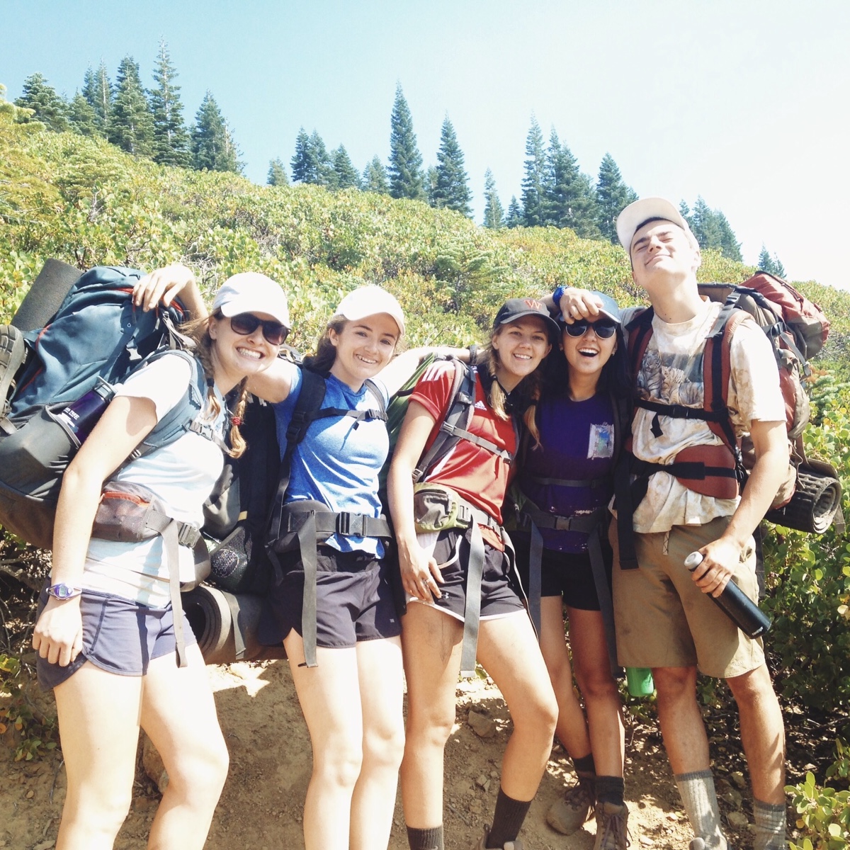 Five young adults wearing backpacks and outdoor gear stand closely together, smiling and posing for a photo on a sunny trail with green bushes and pine trees in the background.