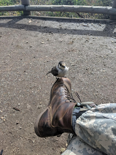 A small bird is perched on the toe of a brown leather boot. The person wearing the boot is dressed in camouflage pants and is sitting on a dirt path near a wooden fence.