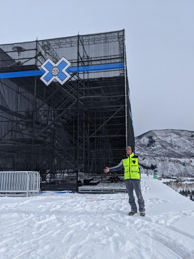 A person in a bright yellow vest stands on snow, arms open, in front of a large metal structure with the X Games logo. Snowy mountains and a cloudy sky are visible in the background.