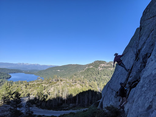 Two people climb a steep rocky cliff with a scenic view of a blue lake, pine trees, and distant mountains under a clear blue sky. A winding road can be seen below in the forested landscape.