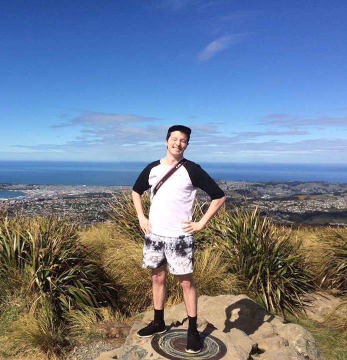 A person stands smiling on a rocky hilltop, hands on hips, with a city, coastline, and ocean visible in the background under a clear blue sky. Grassy plants surround the spot.