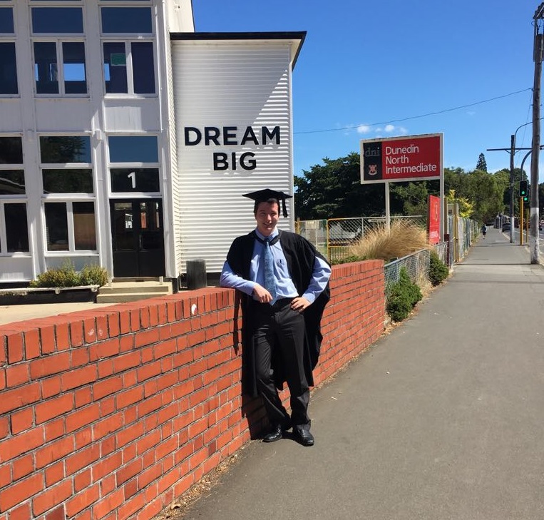 A person wearing graduation attire stands by a red brick wall in front of a building with large letters that read DREAM BIG. A school sign for Dunedin North Intermediate is visible in the background.
