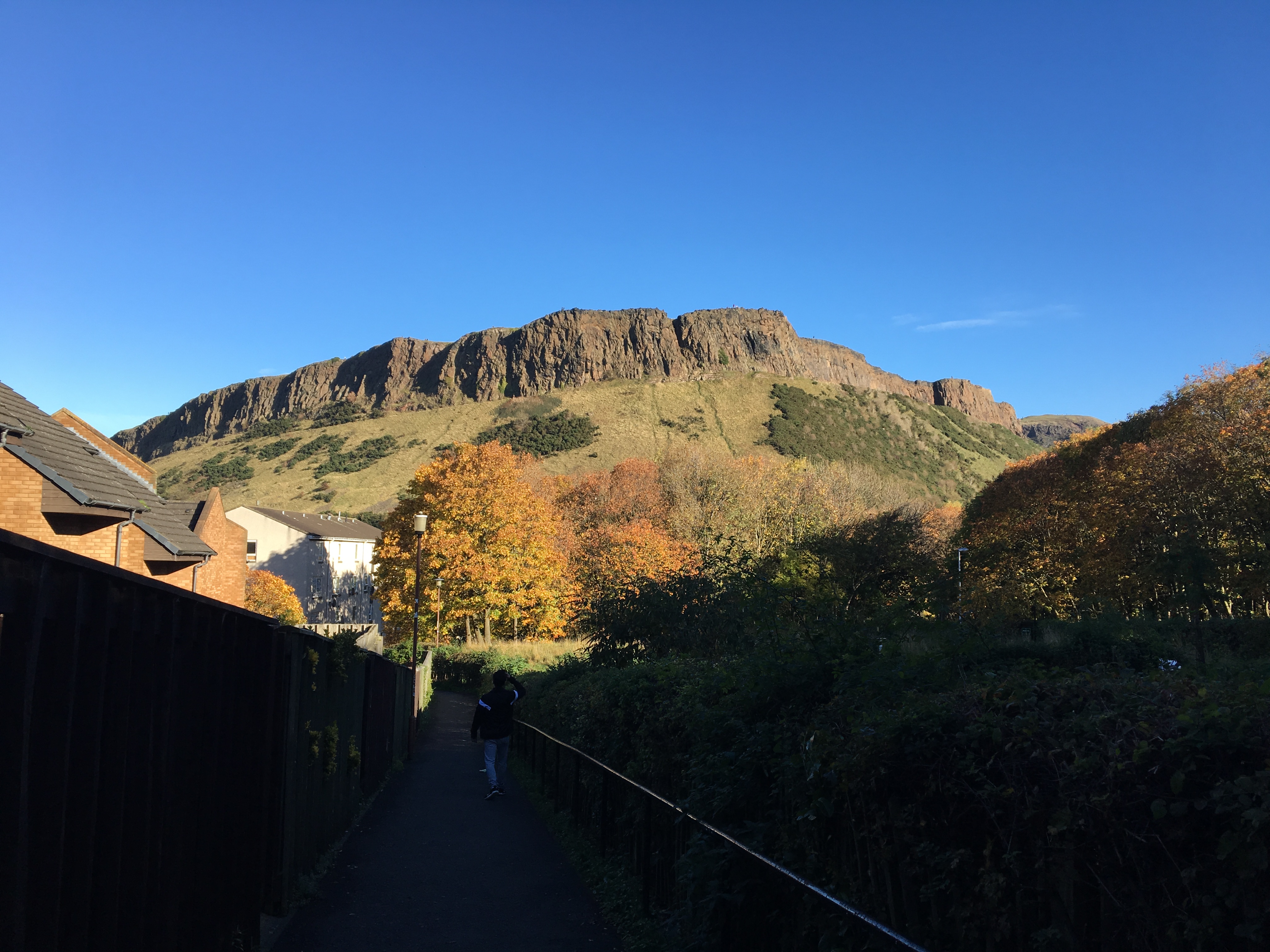 A person walks on a path lined with bushes and autumn trees, leading towards a large rocky hill under a clear blue sky. Houses are visible on the left side of the image.