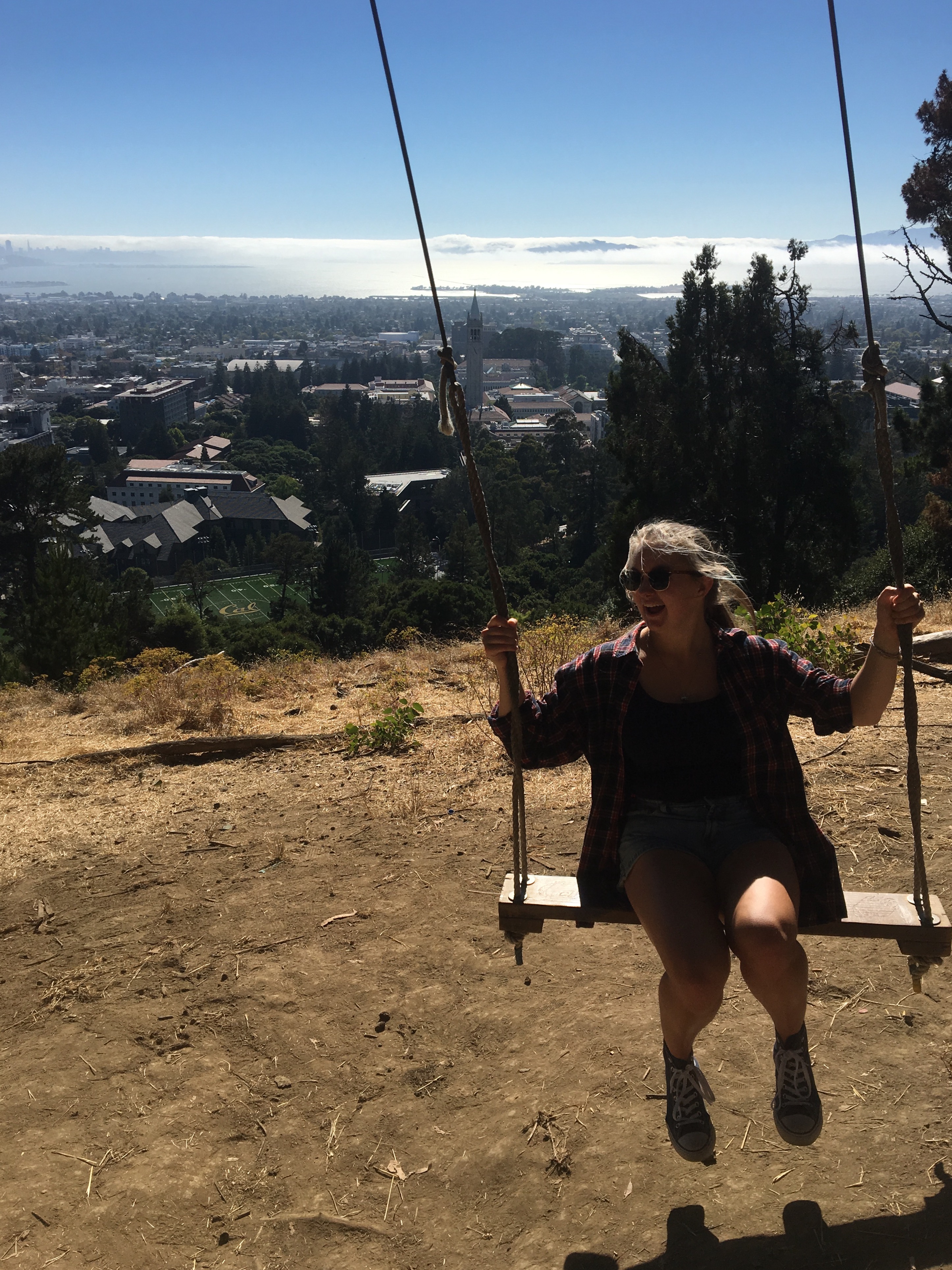 A young woman with sunglasses sits on a swing overlooking a cityscape with trees and buildings below, under a clear blue sky.
