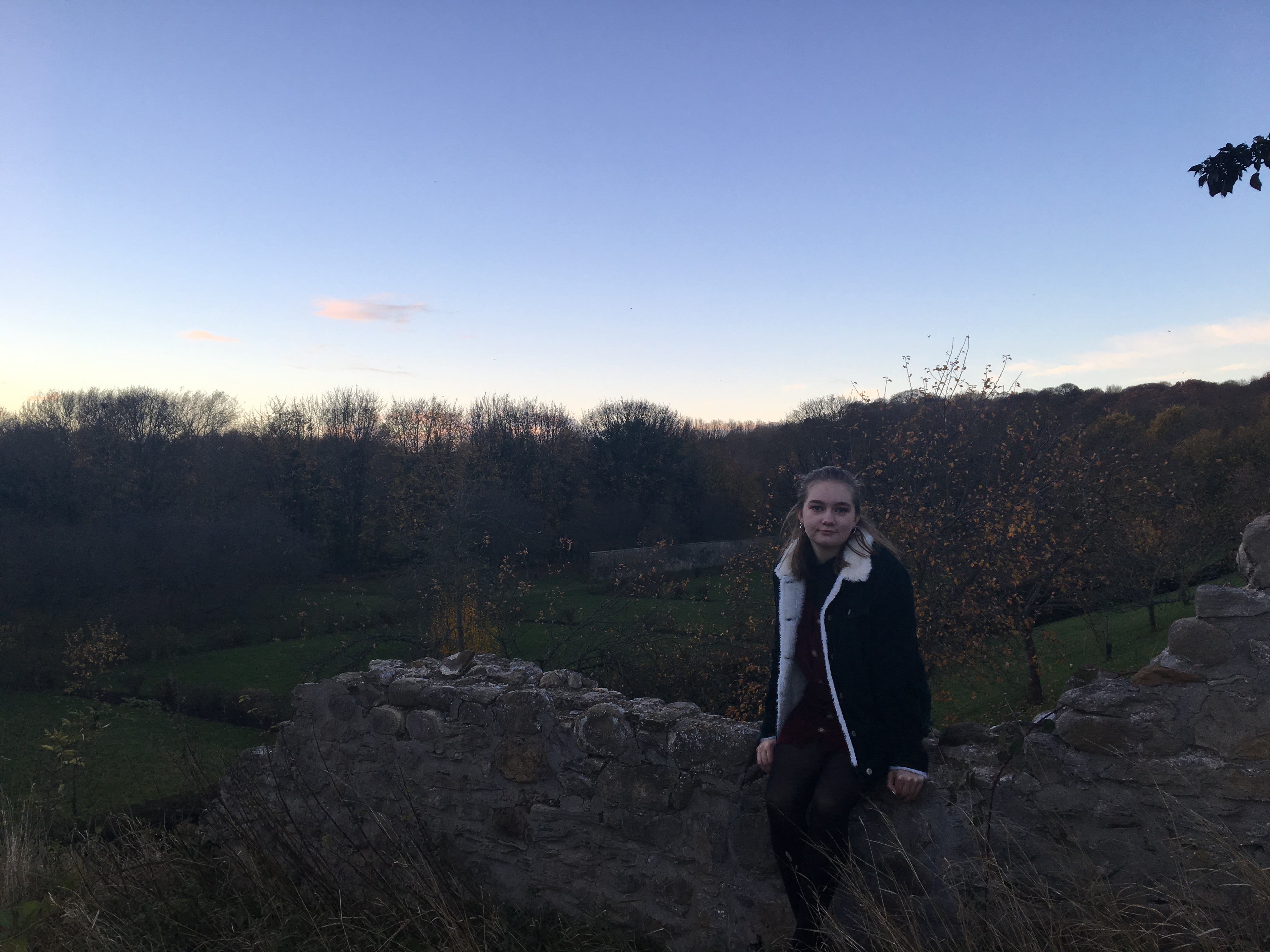 A young woman in a black jacket with a white collar sits on an old stone wall, with trees and grassy fields in the background under a clear evening sky.