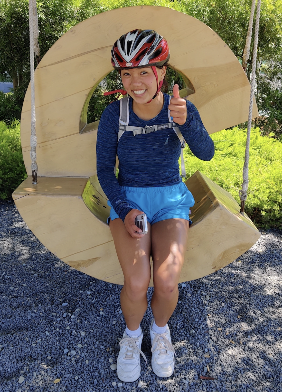 A smiling person wearing a red bike helmet, blue shirt, and blue shorts sits on a large wooden swing shaped like a letter S, giving a thumbs-up gesture outdoors.
