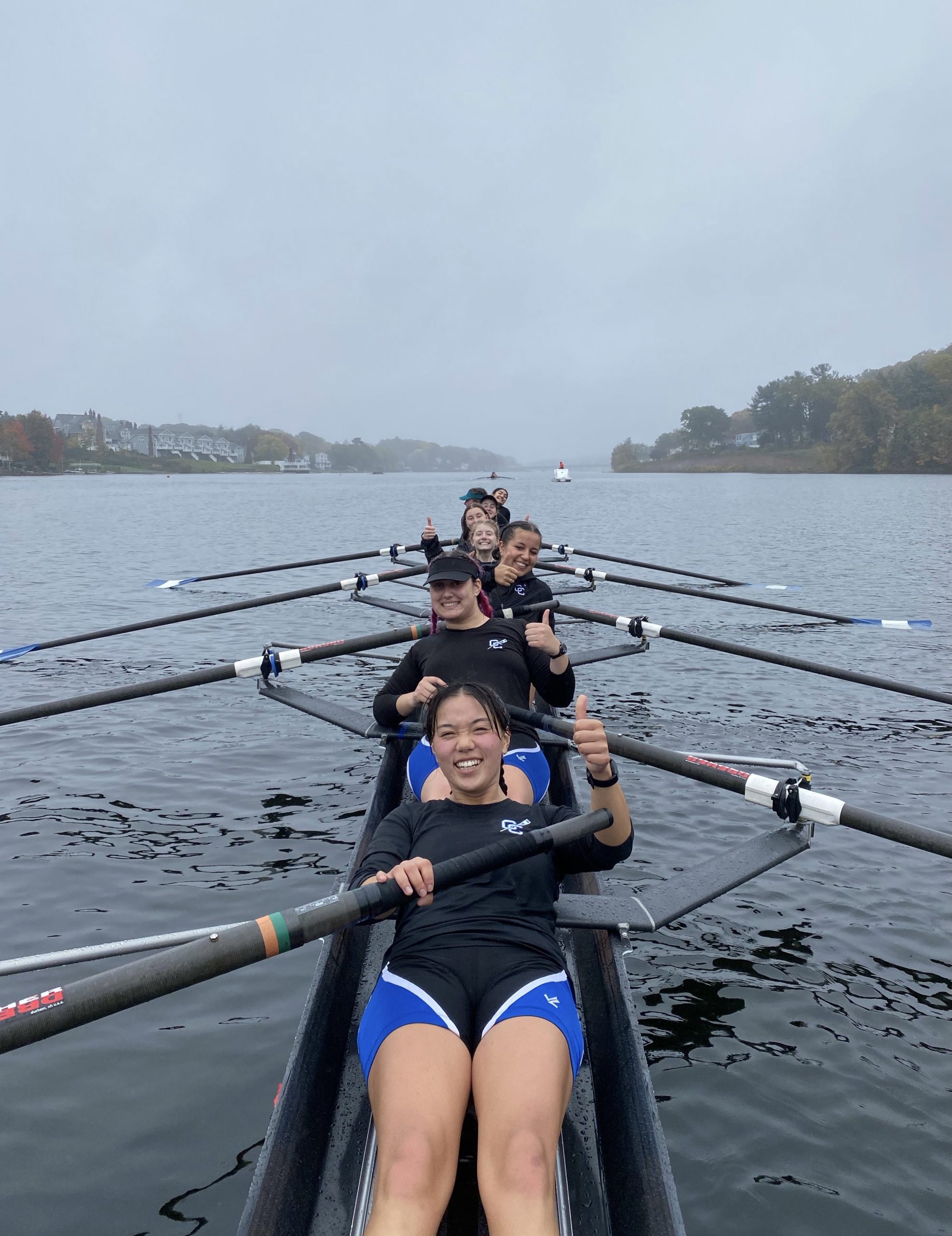 A rowing team of eight people sits in a boat on a calm river, all smiling and giving thumbs up. The team is dressed in matching athletic gear, with trees and buildings visible on the misty shoreline in the background.
