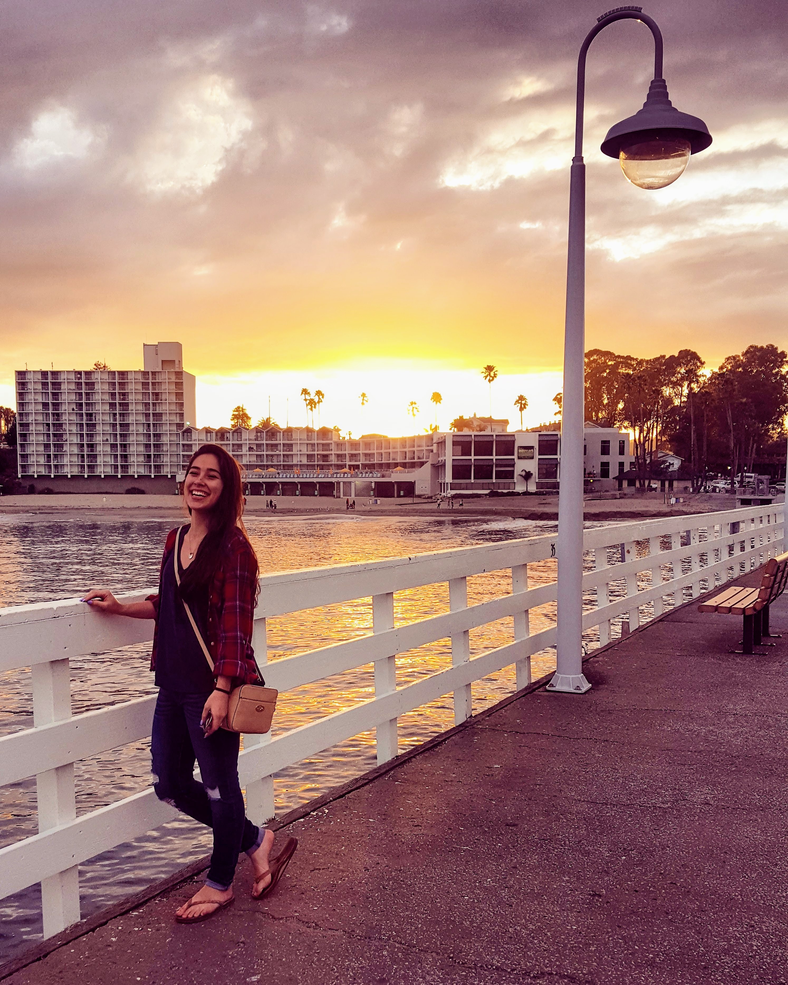 A woman stands smiling on a pier at sunset, with a lamp post nearby, buildings, palm trees, and colorful clouds in the background. The scene overlooks calm water and has a relaxed, warm atmosphere.