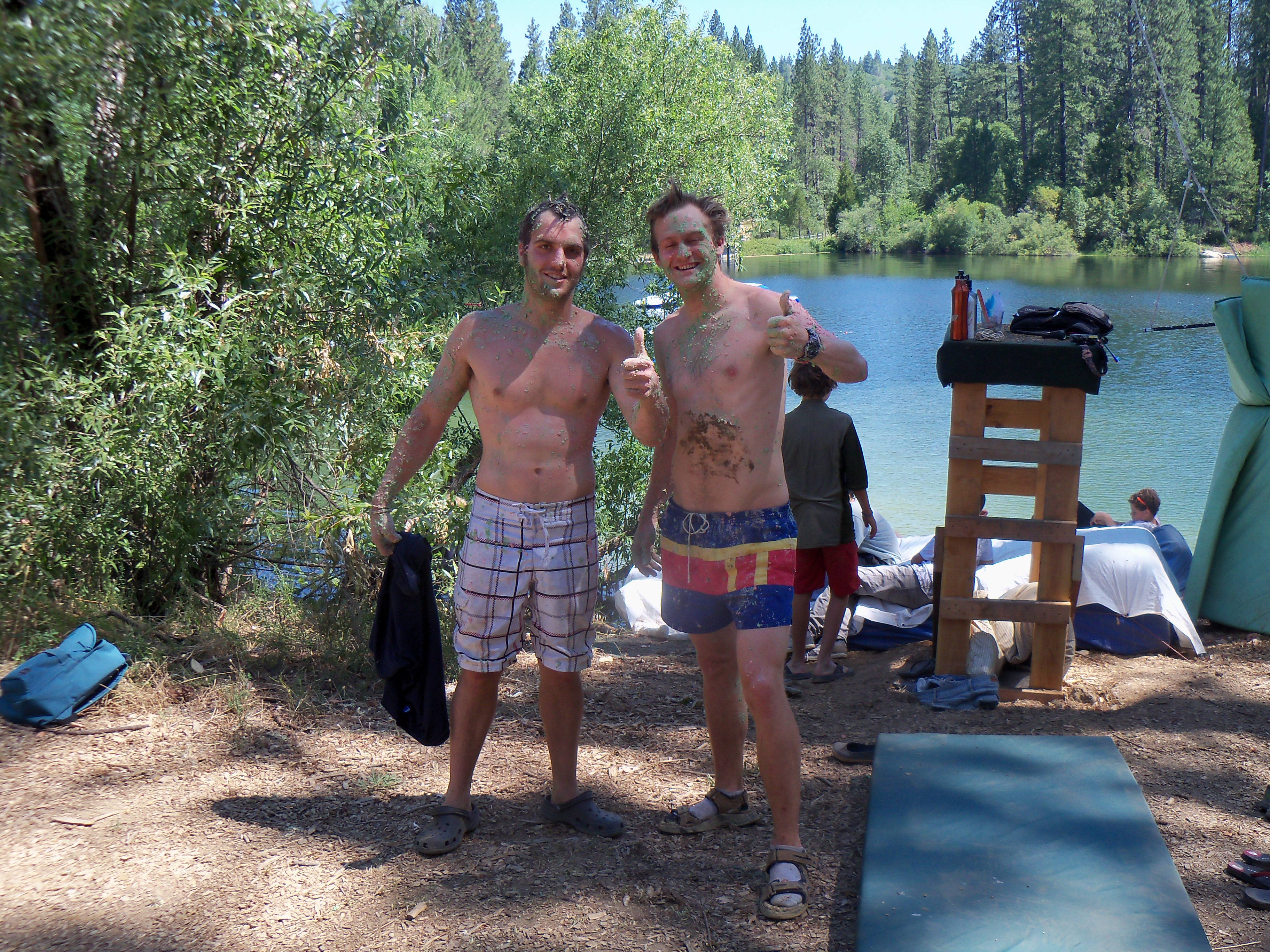 Two men in swim trunks, smiling and giving a thumbs-up, stand by a lake with trees in the background. They are covered in dirt or grass, and others are seen relaxing near the water and a wooden structure.