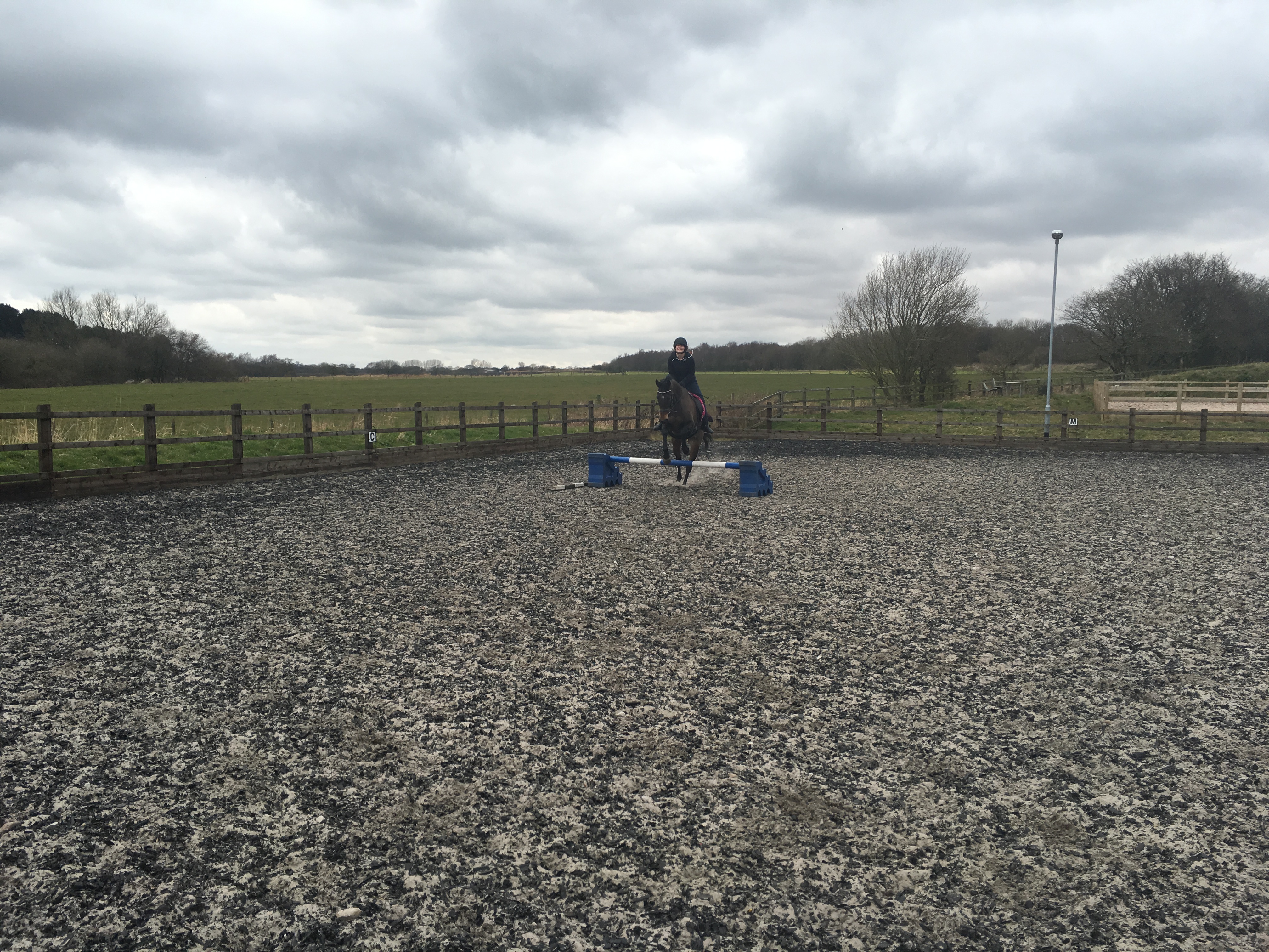 A person rides a horse in an outdoor riding arena, jumping over a small obstacle with blue supports, surrounded by wooden fencing and fields under a cloudy sky.