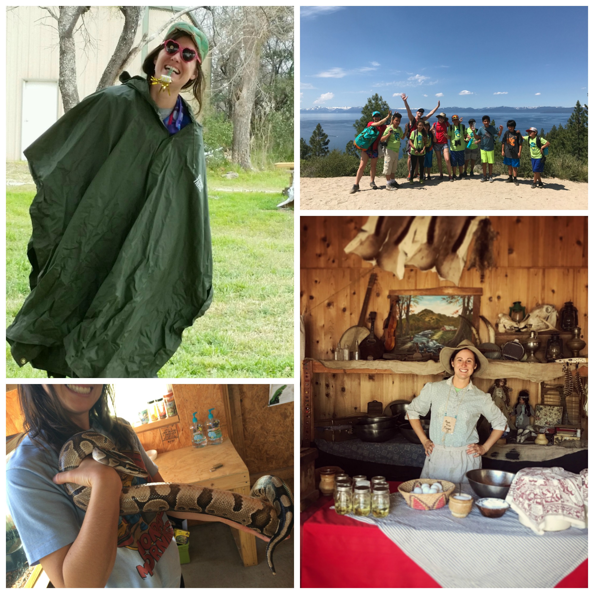 A collage featuring: a smiling person in an oversized green poncho, a group of campers posing outdoors, a person holding a snake, and a woman dressed in pioneer clothes standing in a rustic kitchen.