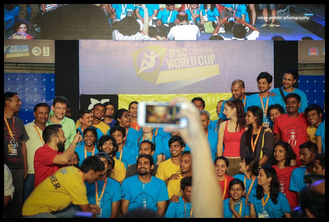 A large group of people in colorful shirts pose and smile for a group photo at the IFSC Climbing World Cup event, while someone in the foreground takes a photo with a smartphone.