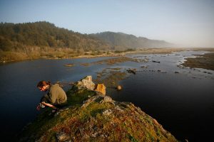 A person in a green hoodie sits on a grassy, rocky cliff overlooking a wide river or estuary, with forested hills and a hazy sky in the background.