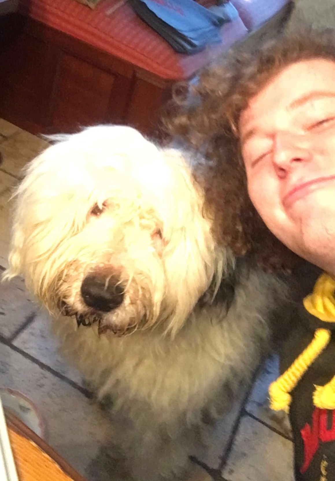 A person with curly hair smiles next to a fluffy white and gray dog indoors, both facing the camera.