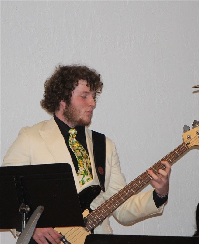 A young man with curly hair, wearing a cream-colored suit and a floral tie, plays an electric bass guitar in front of a white wall. Music stands are visible in the foreground.