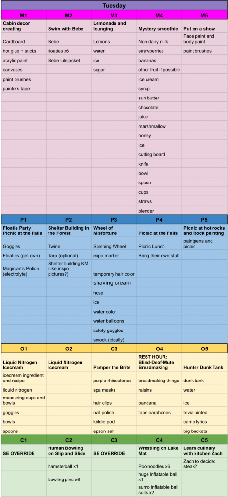For a glimpse of what setting up cabin acts looks like, here’s the actual supply list for one day of cabin acts!