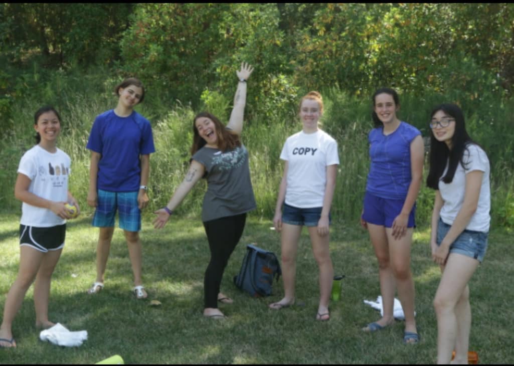 Six smiling young people stand on grass in a park with green trees in the background. One person has arms raised enthusiastically, while others pose casually, dressed in summer clothes.