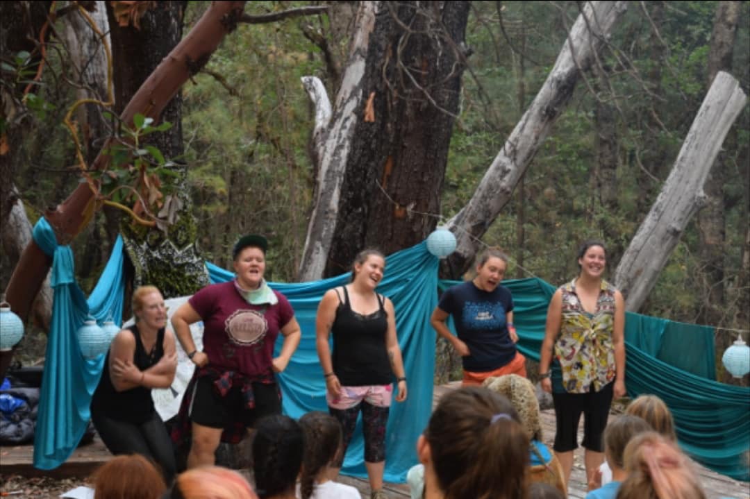 Five women stand smiling and laughing on an outdoor stage, surrounded by trees and teal fabric decorations, while an audience watches in the foreground.