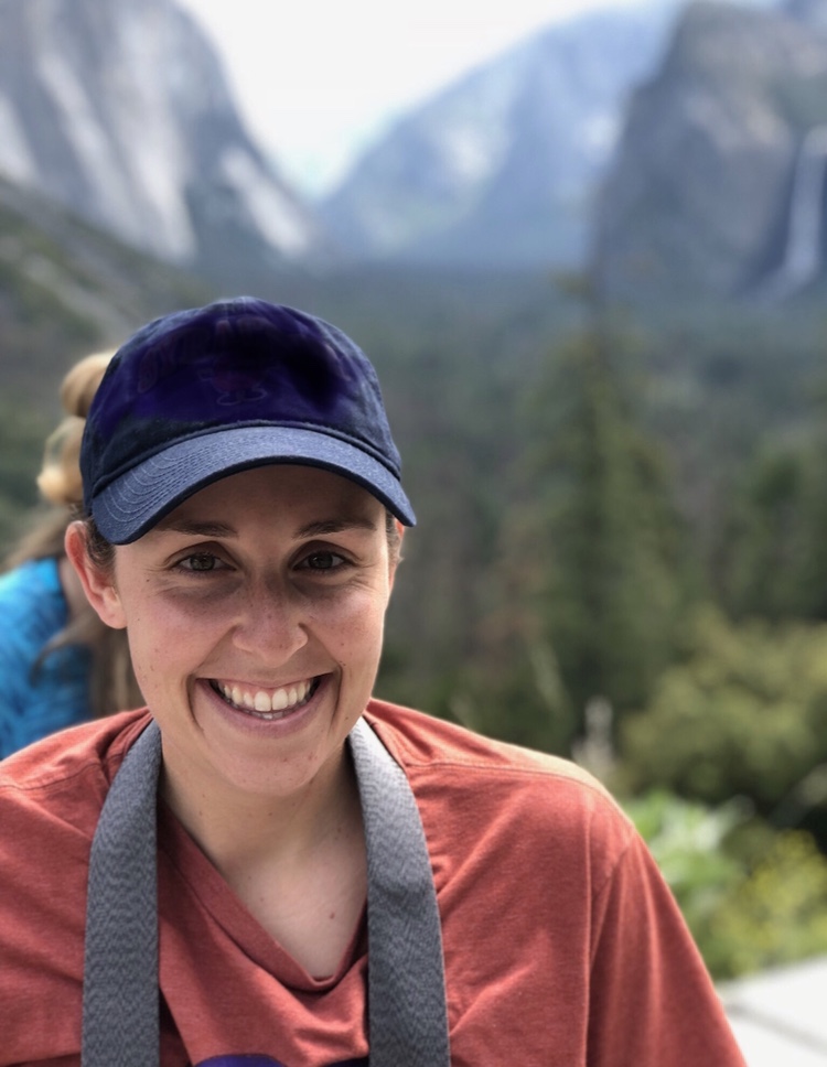 A smiling person wearing a navy blue cap and a red shirt stands outdoors with a blurred background of mountains, trees, and a waterfall.