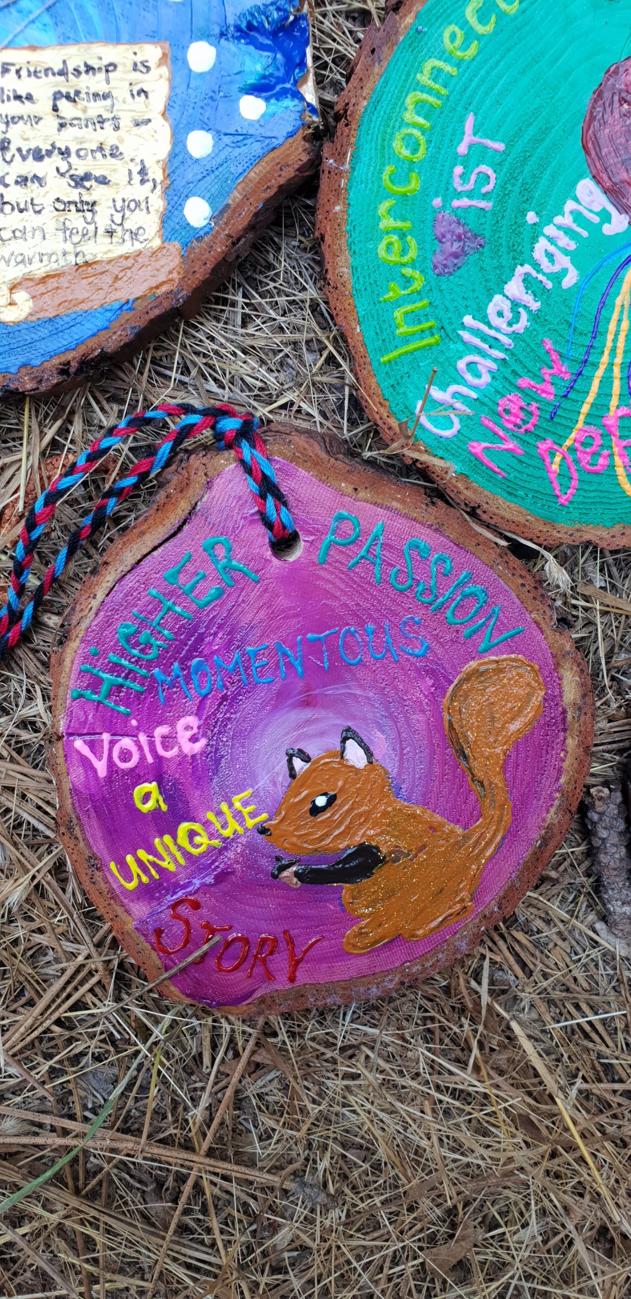 A painted wood slice features a brown squirrel, colorful words like HIGHER PASSION, MOMENTOUS, Voice, UNIQUE, and STORY, with a braided string attached, resting on straw among other decorated wood slices.